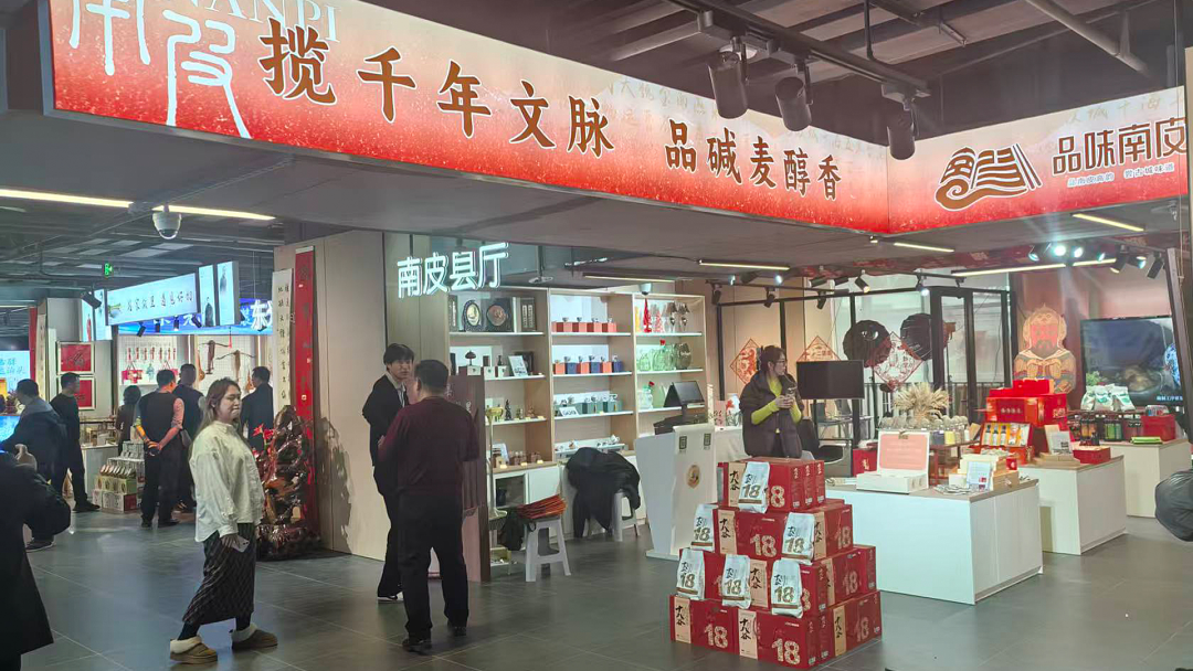 展厅聚焦南皮优势资源,精选碱麦系列、寨子老醋、连胜酱菜、祁家窝头等特色农产品,搭配非遗手工艺品、文创产品等,形成多品类、高品质展陈体系,全方位展现南皮产业底蕴与地域特色,通过线上线下渠道,让南皮好物直达京津冀及全国市场。